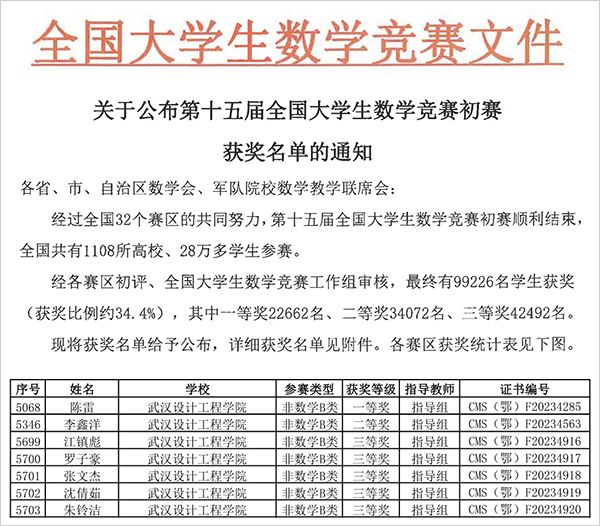 同时,第十二届湖北省大学生数学竞赛结果揭晓。best365学生陈雷获非数学专业组一等奖,李鑫洋获二等奖,张新悦、孙怡等12位同学获三等奖。