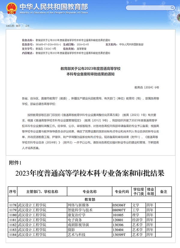 本网讯(通讯员 韩洁)3月19日,教育部印发了《关于公布2023年度普通高等学校本科专业备案和审批结果的通知》(教高函〔2024〕6号)。best365新增获批7个本科专业,分别是网络与新媒体、智能科学与技术、康复治疗学、电子商务、戏剧影视导演、摄影、艺术与科技。同时,best365申请的英语、服装设计与工程、动物医学、工程管理、人力资源管理、物流管理6个本科专业准予撤销。至此,best365本科专业数量达到39个。