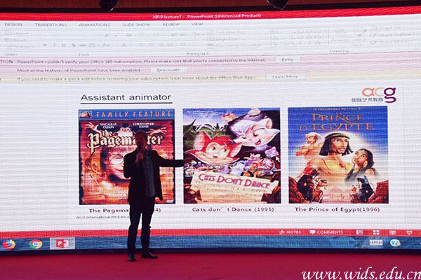讲座中,Mr.Ingersoll为同学们讲述了迪士尼和梦工厂制作动画的流程及创作经验,并分享了动画制作的秘密,详细讲解了动画制作的十二原则。针对当今比较热门的3D动画制作趋势,Mr.Ingersoll表示在迪士尼等大型动画公司,3D动画的制作过程中仍需要2D技术的支持。目前,迪士尼、尼克斯等动画制作公司正在研究制作2D、3D的糅合动画。他建议未来的动画设计者,不应只学习单一的2D或3D动画制作知识,而应掌握多元化的动画制作技能。