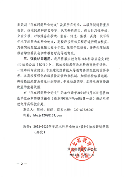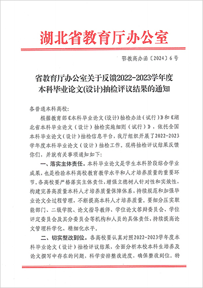 本网讯(通讯员 程凤)近日,湖北省教育厅下发了《关于反馈2022-2023学年度本科毕业论文(设计)抽检评议结果的通知》,best365被抽检的49篇本科毕业论文(设计),经专家评议全部合格。至此,best365本科毕业论文(设计)抽检连续两年通过率为100%。