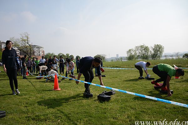 “哎呀,你快点啊,加油加油!”这是湖边草坪上“摸石头过河”障碍点热闹的加油声;