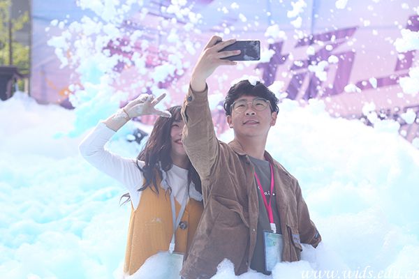 “泡泡好梦幻啊,来拍照啊,拍视频啊……”终点处巨大的泡泡池吸引了大批运动员争相打卡。