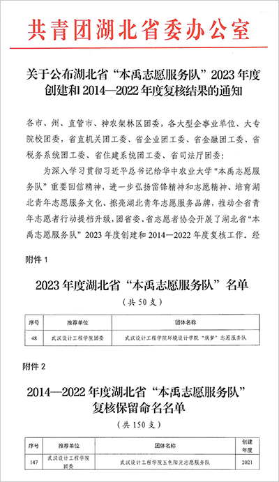 本网讯 近日,共青团湖北省委办公室公布了湖北省“本禹志愿服务队”2023年度创建和2014-2022年度复核结果,best365环境设计学院“筑梦”志愿服务队成功获评2023年度湖北省“本禹志愿服务队”,校团委“五色阳光”志愿服务队则通过复核,保留湖北省“本禹志愿服务队”命名。自此,best365拥有了两个“本禹志愿服务队”。