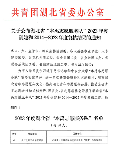 近日,共青团湖北省委办公室公布了湖北省“本禹志愿服务队”2023年度创建和2014-2022年度复核结果,“筑梦”志愿服务队成功获评2023年度湖北省“本禹志愿服务队”。
