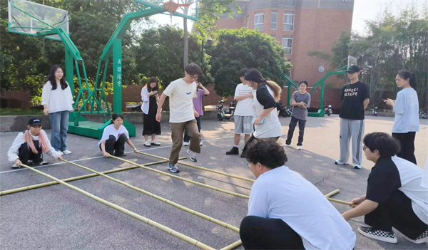 “竹竿悠悠山水间,歌舞翩翩山舞筵。”座谈会结束后,师生们来到户外水泥篮球场,踊跃体验壮族“跳竹竿”。在壮族同学的带领和指导下,同学们两两一组,面对面蹲在两旁,双手各握一根竹竿的末端,来回滑动,使竹竿有节奏地合击与分开。跳竿的同学则跟随着竹竿的“开合开开合”,在竹竿滑动相撞的空隙中进退跳跃。在欢声笑语中,壮族同学展示了高难度的花样跳竹竿,精湛的技艺、默契的配合、优美的动作赢得现场同学们掌声连连。