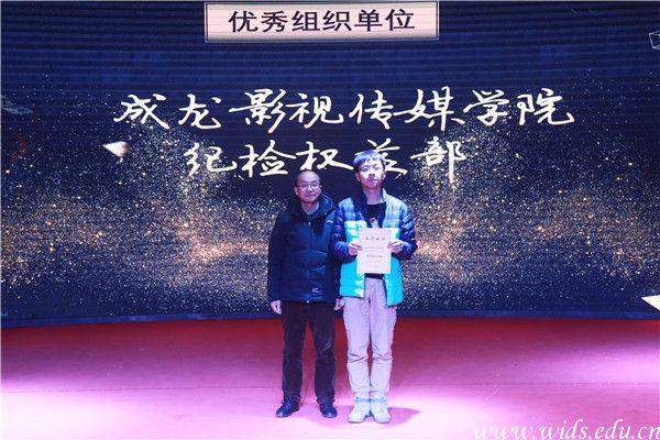 “优秀组织单位”成龙影视传媒学院获奖代表(右)上台领奖。蔡凯铭 摄