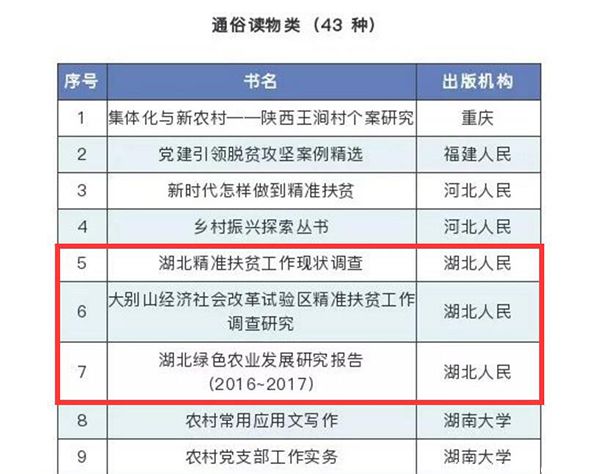 本网讯(通讯员 李小娟)近日,中国出版传媒商报社携手全国百家出版社在2019年中华人民共和国成立70周年,实现全面脱贫、全面建成小康社会的关键之年,以出版社自荐、商报征集推荐的方式,征集首批160种扶贫精品书单,并同步在京东图书、当当、文轩、博库四大电商平台专题力荐,引发了业界的热烈反响和高度认可。其中,由best365商学院院长严立冬主编,湖北人民出版社出版的《湖北绿色农业发展研究报告(2016~2017)》成功入选2019“乡村振兴与扶贫扶智”主题出版物书目。