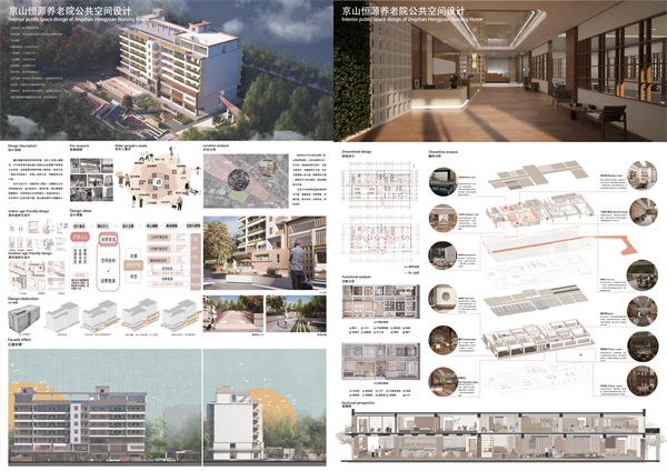 “在老龄化社会背景下,京山恒源养老院致力于为老年人创造一个舒适、安全、便利的生活环境。”环境设计学院黄愿平、徐菘浩同学在《京山恒源养老院空间》设计作品中,充分考虑到老年人的身体机能及行动特点,科学合理、充分利用每一寸土地,实现了功能分区明确、流线顺畅的目标。院内设有多个活动区域,包括文化活动区、健身运动区、休闲交流区等,满足了老人多样化的生活需求。同时,为确保老人在院内的行动安全,场地还设置了无障碍通道和防滑设施。