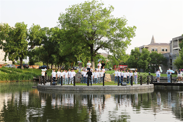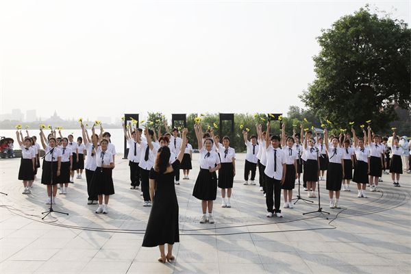 文化创意管理学院以汤逊湖为背景合唱《有我》。吴琬雯 摄
