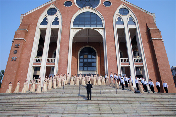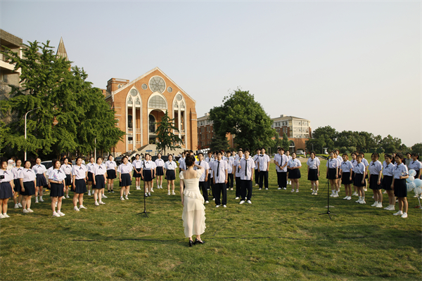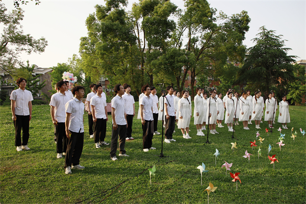 移步湖边,茵茵草坪、夕阳缓沉,阳光照耀在食品与生物科技学院合唱团成员的脸上,《最初的梦想》唱响学生的豪言壮志。“世间所有路都将与你相逢,而我将爱你所爱的人间……”亚心护理学院在希言楼阶梯上唱着《如愿》,两旁的紫藤花和院中翠竹化为最忠实的听众。