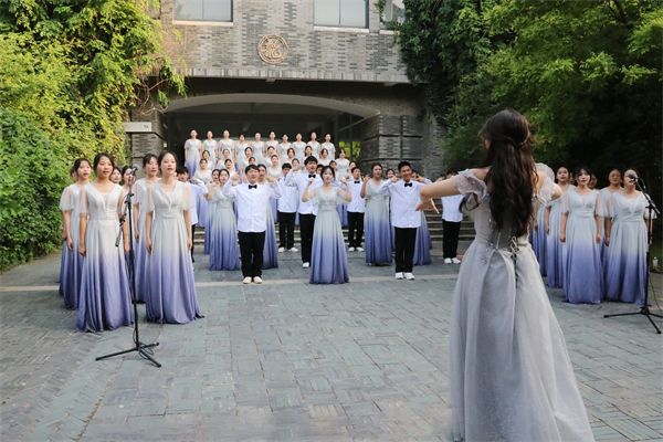 与往年不同的是,今年的合唱比赛首次将室内演唱改为室外竞演,九支合唱队从图书馆唱到荷花池,从教学楼唱到人工湖,他们把学校建筑连廊、中庭花园,以及花木藤萝等作为演绎背景,观众们则像游园一样,一边欣赏校园美景,一边跟随合唱队倾听美好音乐,为观众们送上了一场别开生面的视听盛宴。