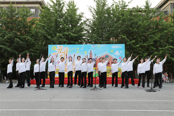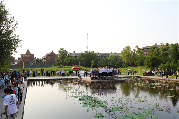智能工程学院《夏天的梦是什么颜色呢》正好与初夏的荷塘契合,初绽的荷叶、扶摇的芦苇和满池的彩色纸船仿佛是最好的回答。下一站,环境设计学院《如果明天就是下一生》,抒情婉转的曲调与斜坡草坪相融,诠释青春的活力与激情。