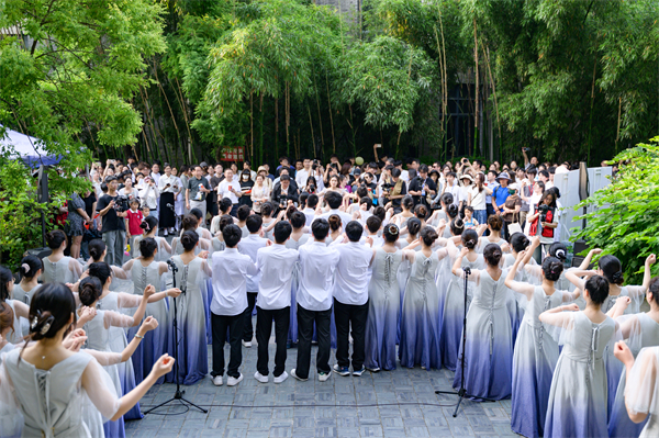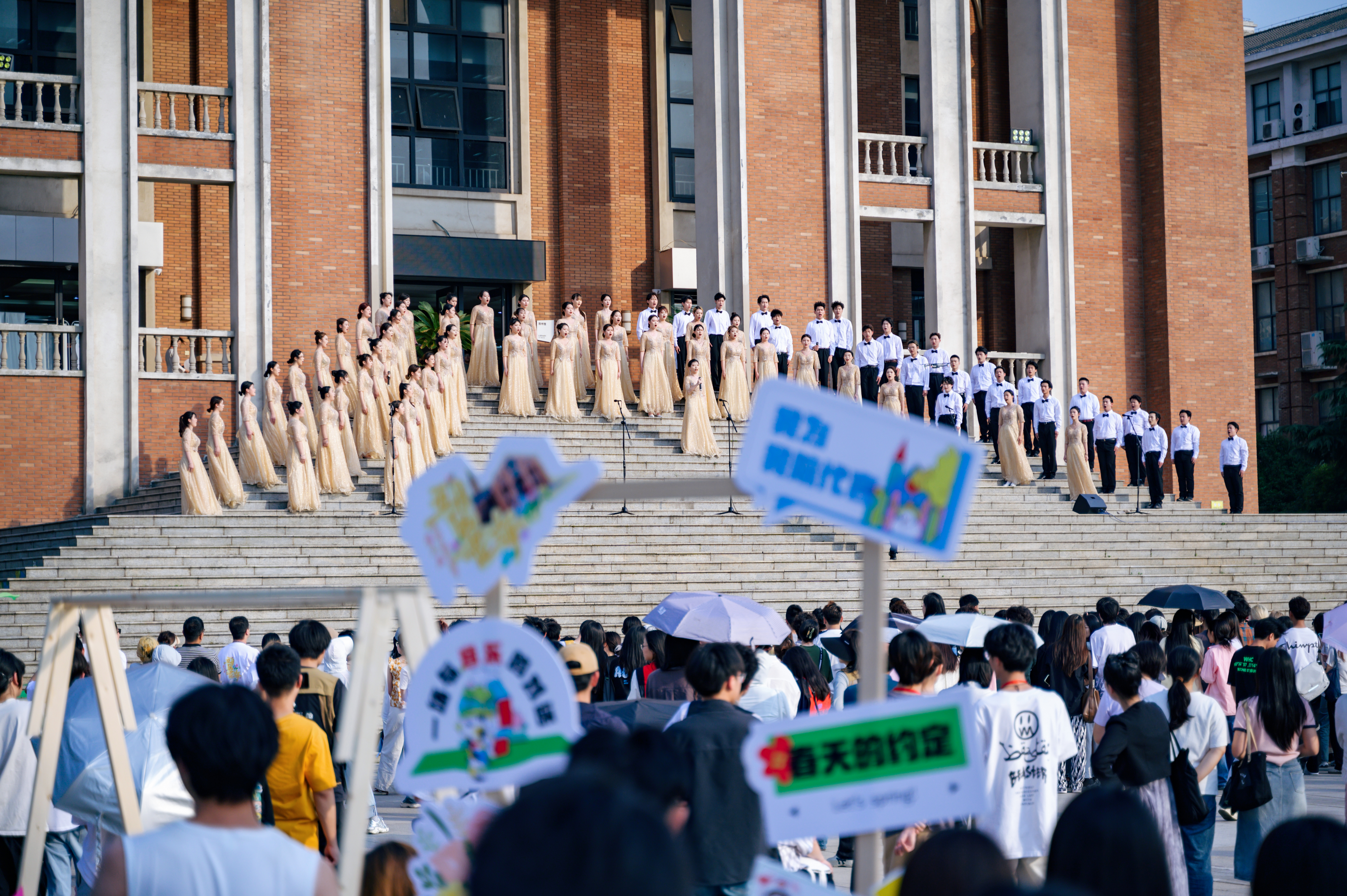 “致所有顶天立地却平凡普通的无名的人啊……”时尚设计学院在鹤鸣楼中庭带来一场《无名的人》音乐剧,从楼顶到窗台,从摇曳的红旗和飘舞的彩带,都是他们的背景,创意满分、细节满满。大学生寻音合唱团人工湖湖心小岛C位开唱,湖光潋滟、绿柳轻摇,《平凡之路》深情歌声从湖心荡漾而来,音乐与自然完美结合。