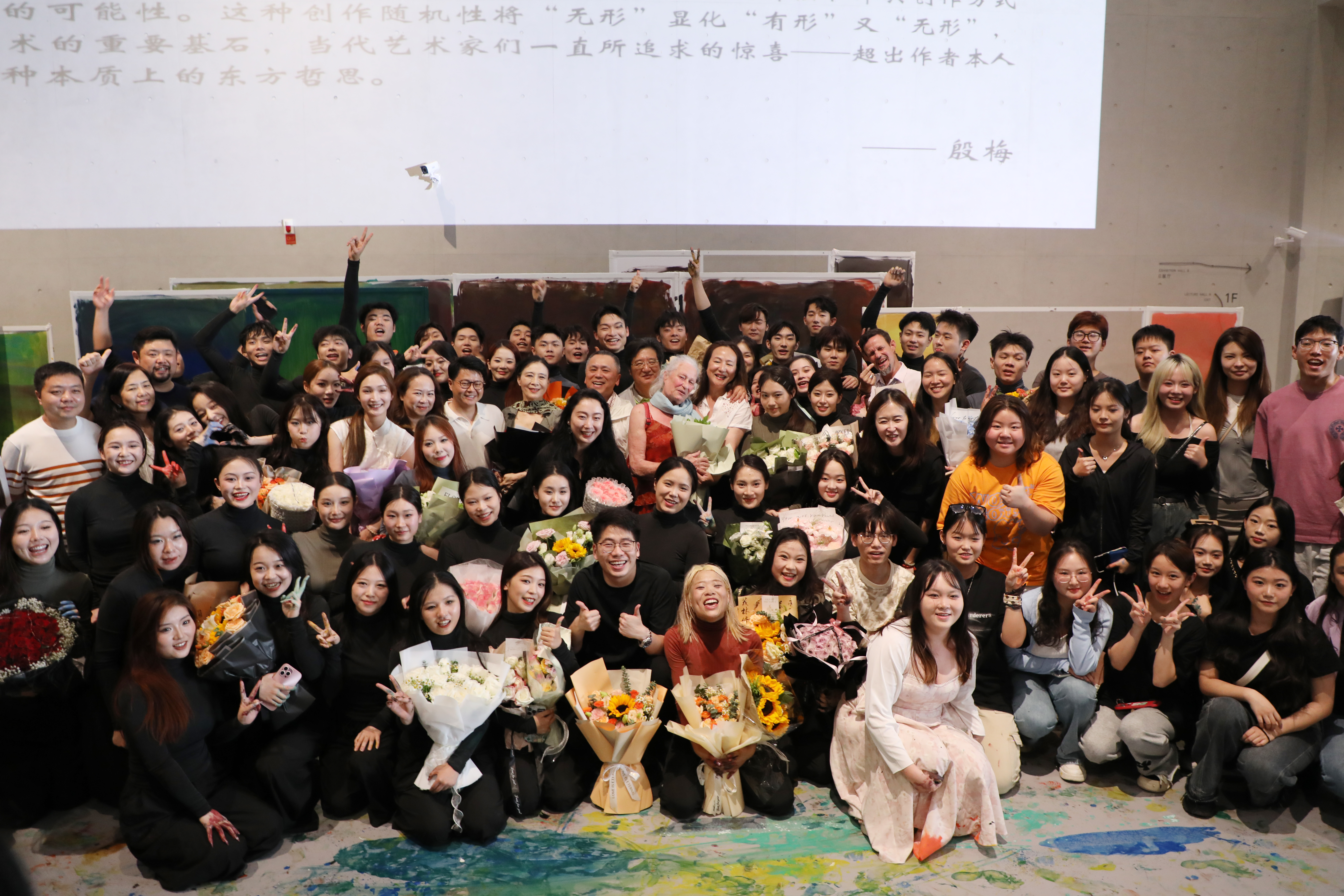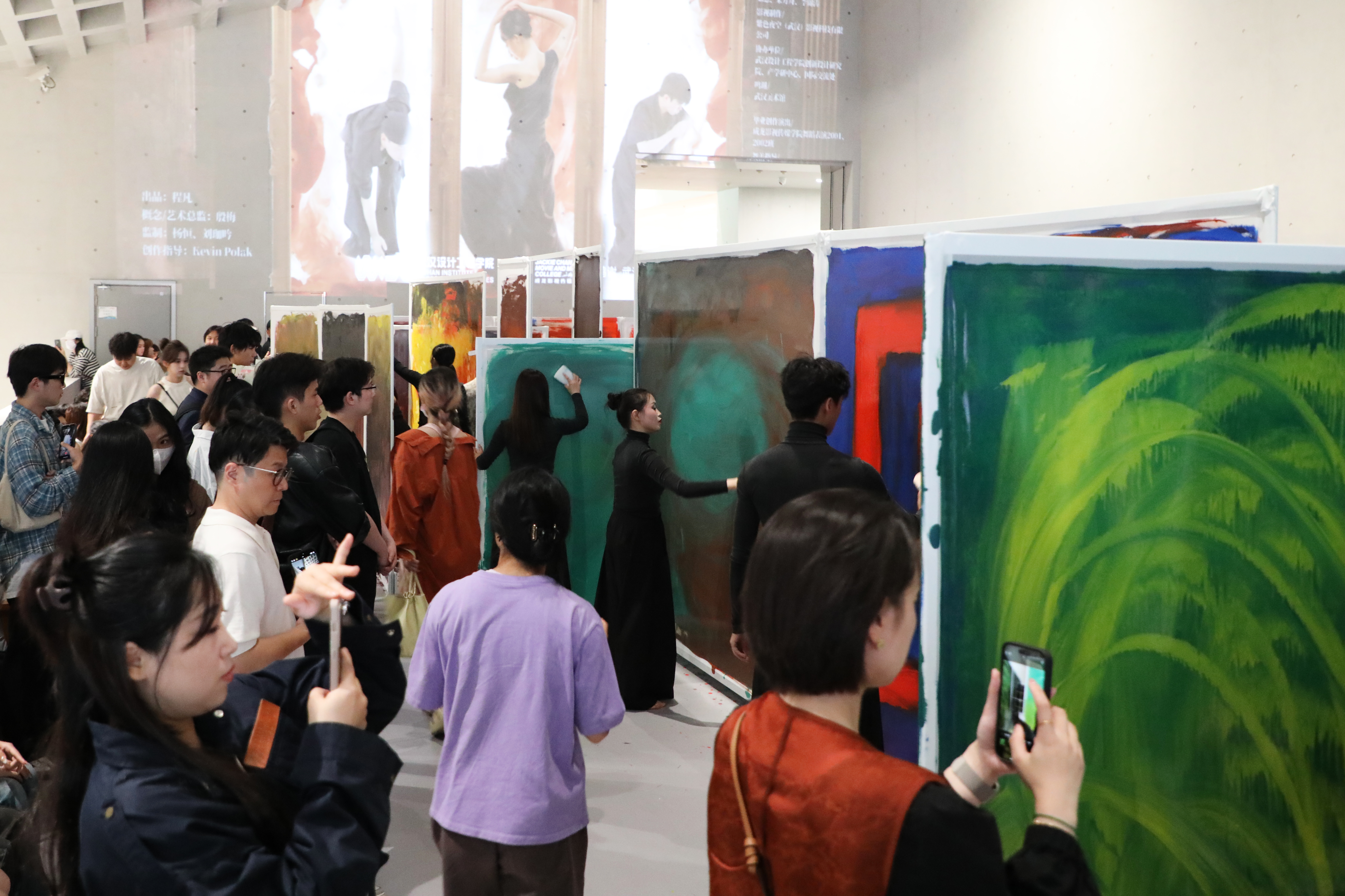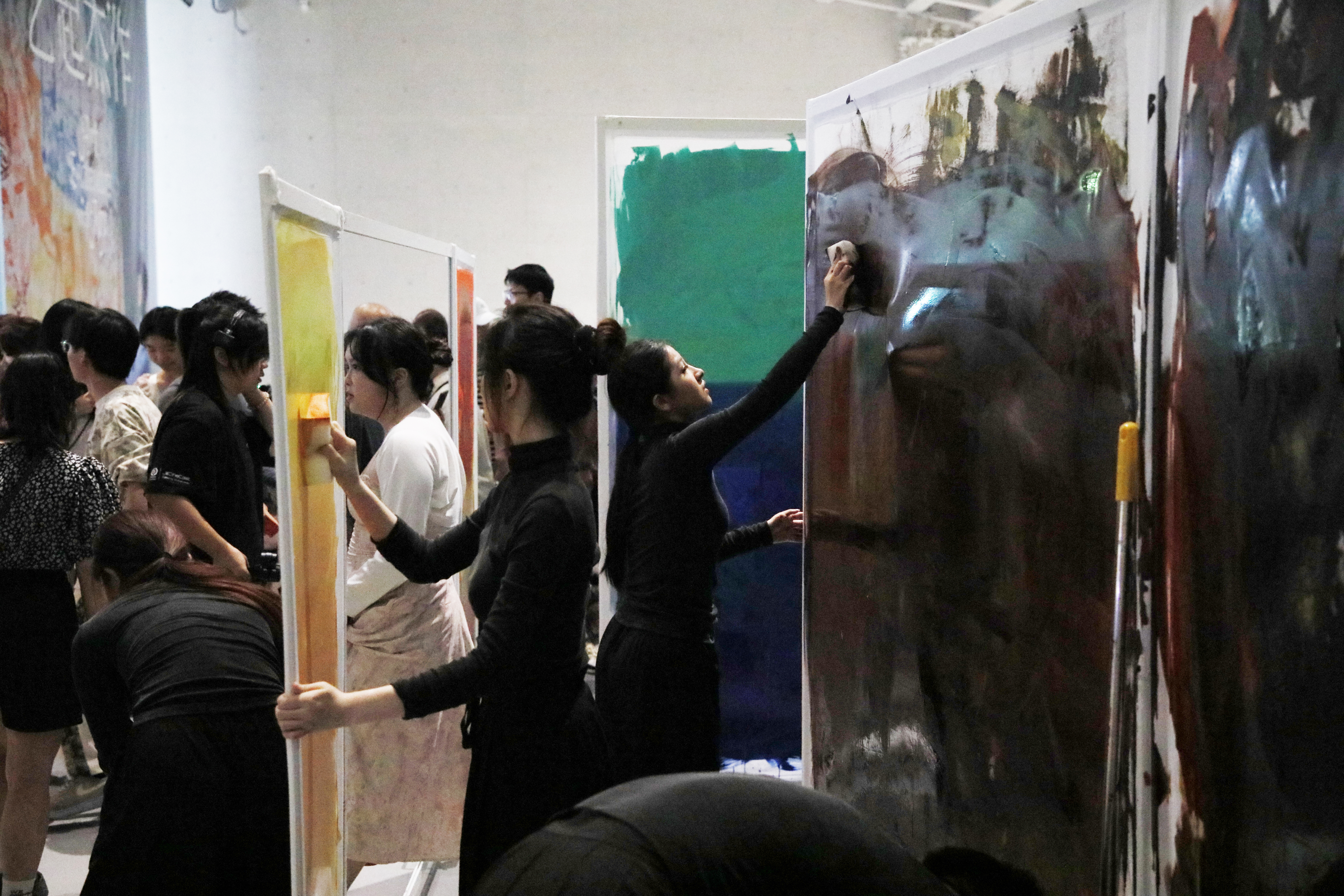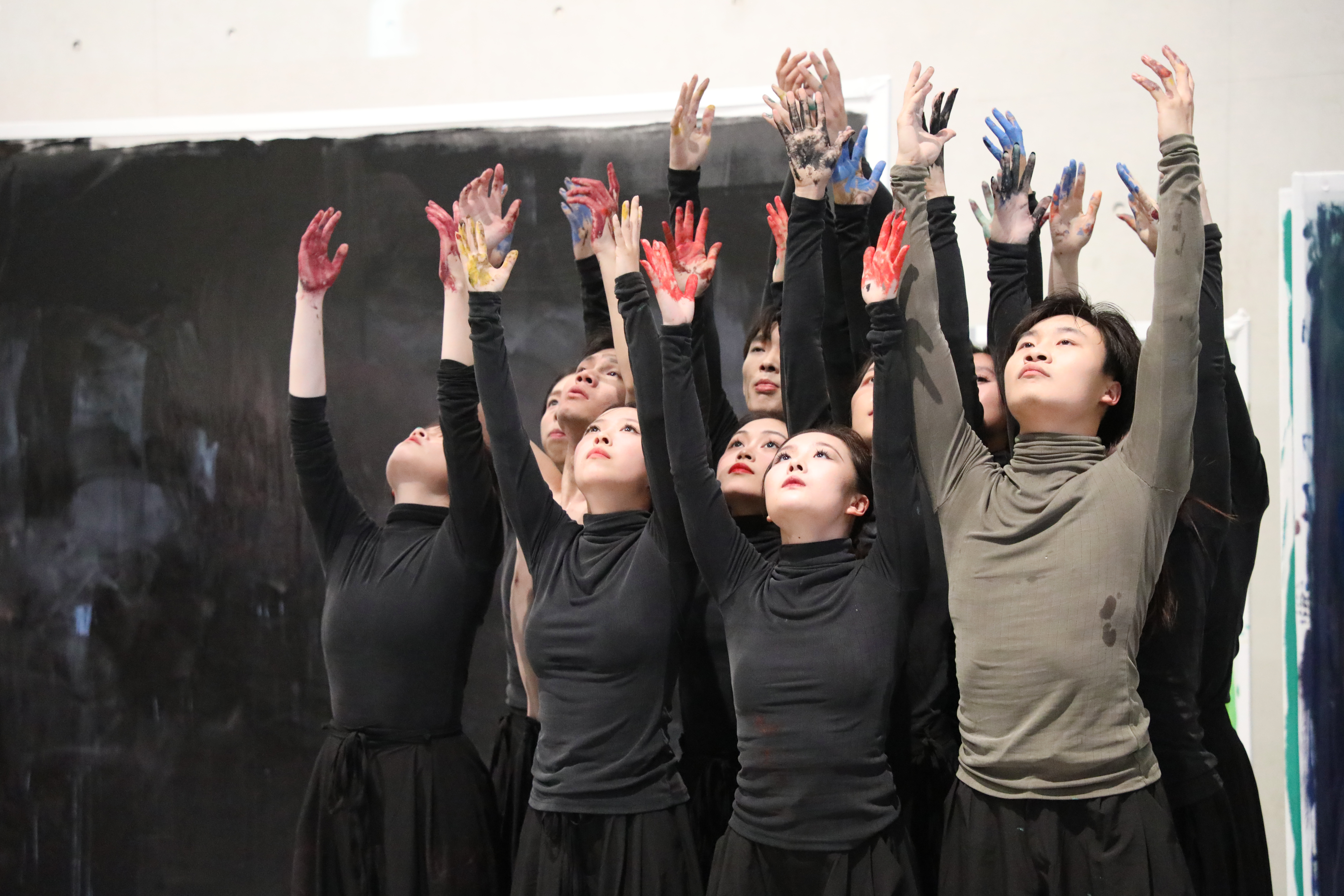 “舞蹈的创作灵感来源于学校舞蹈表演专业首席教授、当代戏剧舞蹈艺术家殷梅教授对英国画家弗朗西斯·培根‘三联画’的深入解读。”成龙影视传媒学院戏剧舞蹈系主任何艺斐老师介绍,该舞蹈以“三联画”为锚点,融合了视觉艺术、戏剧、舞蹈三种艺术形式。48位舞者以肢体作画,将动作的痕迹固定在画布上,现场演绎与流动的“即时投影”在时空中交错,形成震撼的3D视觉体验,为现代舞蹈形式注入了新的活力。