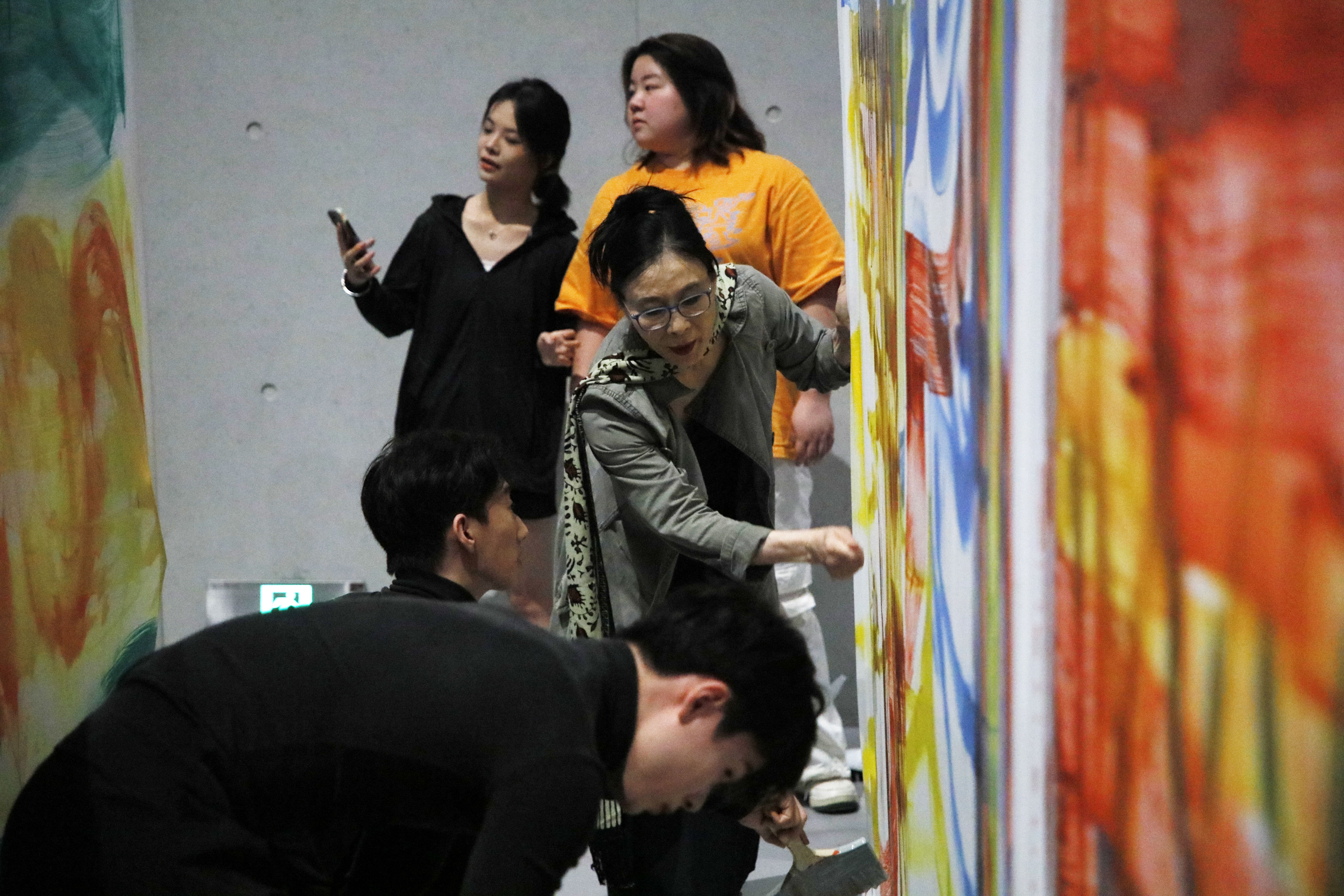 演出伊始,随着时而汹涌时而宁静的舞蹈节奏,舞者们先将五彩斑斓的颜料涂抹在空白的幕布上,随后又赤脚站于舞台中央挥洒颜料,即兴创作。他们优雅的身姿不时在空中翻飞、旋转,每一个动作都如同精心雕琢的艺术品,时刻牵动人心。舞台四周和地面上逐渐呈现出来的即兴画卷,将舞者们丰富的内心情感完美地展现在观众眼前。
