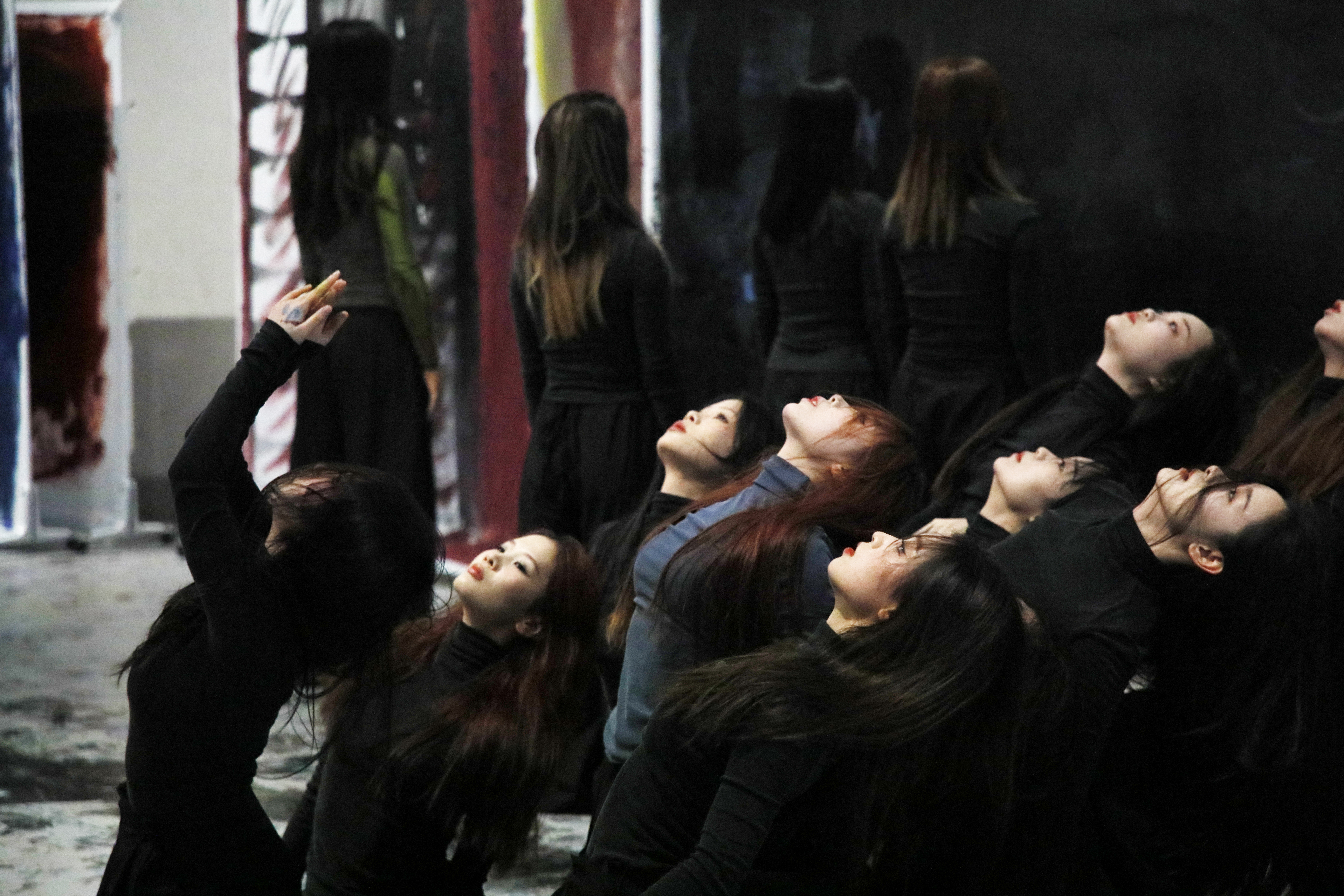 指导老师,舞蹈表演专业首席教授、当代戏剧舞蹈艺术家殷梅教授(中)与同学们一起创作。刘恒 摄
