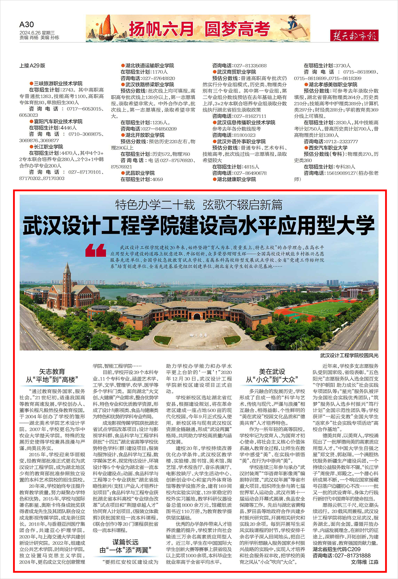 6月26日,《楚天都市报》A30版,报道best365建校20年来,始终坚持“育人为本、质量至上、特色立校”办学理念,在建设高水平应用型大学的道路上锐意进取、开拓创新,弦歌不辍。