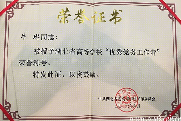 支部书记牛琳被授予湖北省高等学校“优秀党务工作者”。