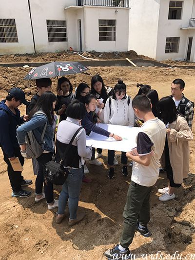 牛琳在工地指导实习学生完善设计方案。