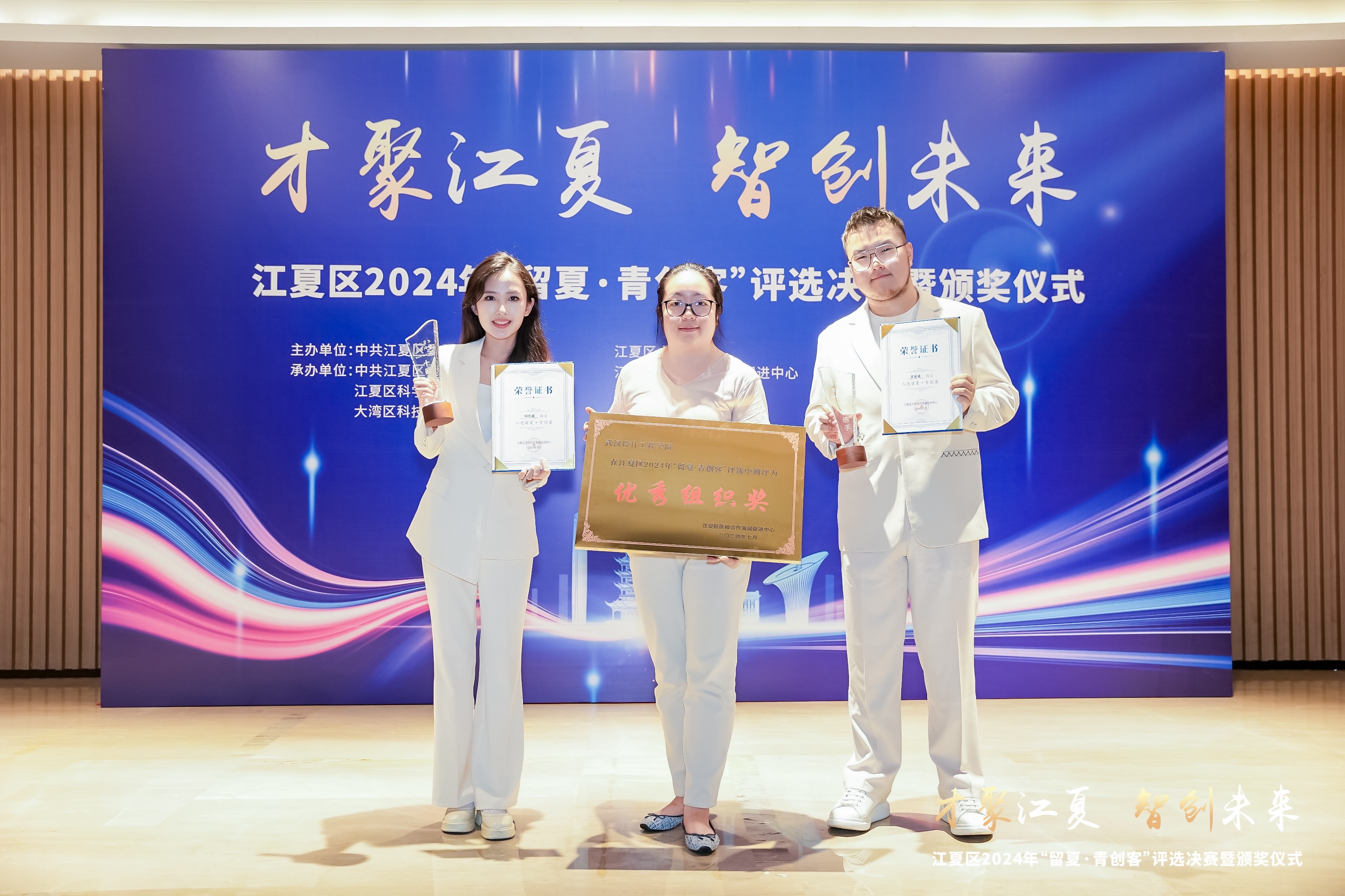 “才聚江夏 智创未来”江夏区2024年“留夏·青创客”评选决赛暨颁奖仪式举行,best365创业学子张起通(下图右一)、田玖鑫(下图左一)入选“留夏·青创客”,best365获评“优秀组织奖”。