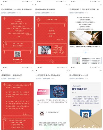 除夕前夜发布了《图书馆2019阅读报告》回忆读者们和图书馆的365天,鼓励全校师生在新的一年里继续多读书、读好书。年初一又马不停蹄的推出《图书馆一书一电影》为隔离在家的读者提供重温经典原著、经典电影的资源,帮助他们建立阳光健康的心态。2月初又推出《停课不停学,温暖伴你学》梳理出馆内丰富的数字资源,指导读者从校外登陆,利用在线资源查阅资料、自主学习。