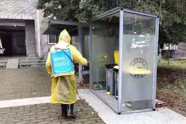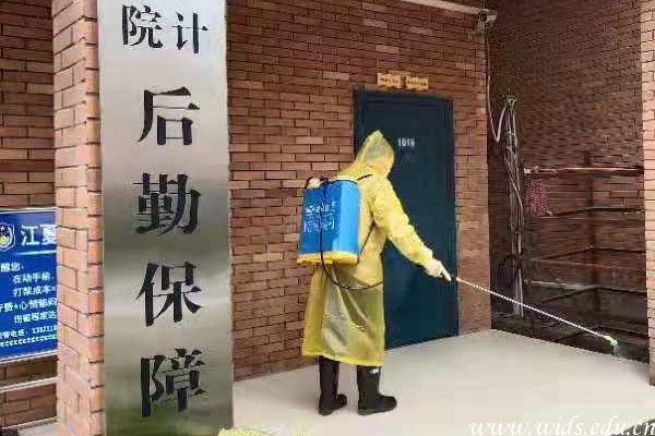 除了每天监测体温,校园消毒也是防疫工作的重要一环。每天,尹保松都会组织物业工作人员对学校值班室、得一堂、寒烟楼、物业食堂、后勤楼等重要场所进行消毒处理。“来自物业的消毒人员大多住在校外,为减少不必要的人员流动,我们为他们在校内安排了宿舍,既减轻他们往返于家和学校的奔波之苦,更是将疫情坚决封堵在校门外”。尹保松表示。