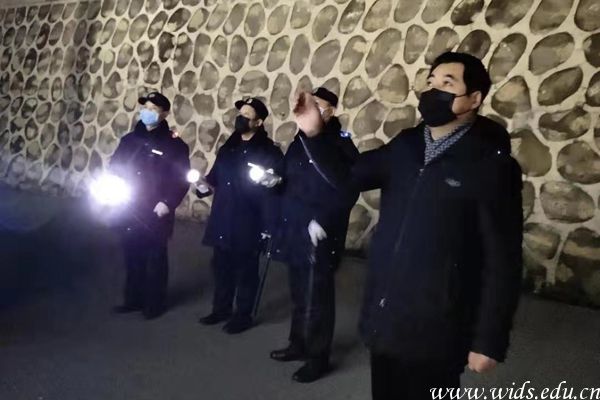 夜晚,尹保松(左一)带领值班人员巡守校园。