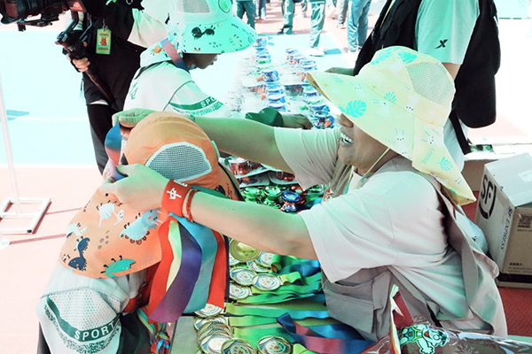 “武术训练动作”“非遗投壶”“趣味沙包”运动会上孩子们互相帮助、彼此信任,合作“闯关”,共同领取到了爱心企业捐赠的通关礼物和通关奖牌。