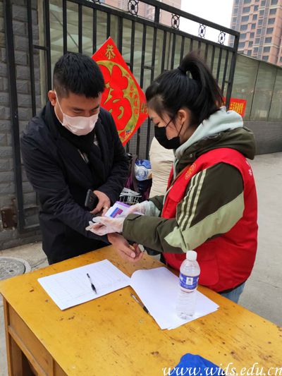 我是成龙影视传媒学院动画1701班的王泽嘉泺,我在振二街北苑社区负责社区口登记以及体温测量工作。