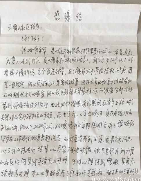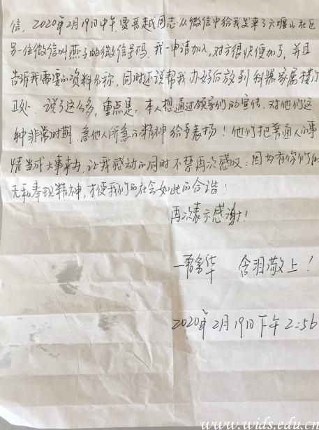 为做好新型冠状病毒防疫宣传工作,计算机科学与技术1801班贾晋越同学参与了十堰市六堰山社区的疫情防控工作。在疫情防控期间,贾晋越同学致力于疫情工作的宣传与实时监控,在负责的社区安全卡点,通过发放传单、检测体温等方式,让当地居民了解实时疫情动态与自身健康情况。对来往车辆进行登记,保证社区能够及时掌握居民的去向与到访人员的信息。在2月18日晚,一名社区群众在非常时期需要前往医院照顾亲属,寻求贾晋越帮助,其耐心、周到的帮助该群众办理了相关手续,且收到了群众的一份感谢信。贾晋越说道:“身为一名入党积极分子和学生会干部,就应该有担当和冲锋精神,有大局观念,在这场消灭病毒的战争中,胆大心细,科学防控,牢牢扼住病毒传播渠道,才取得最终的防控胜利!”