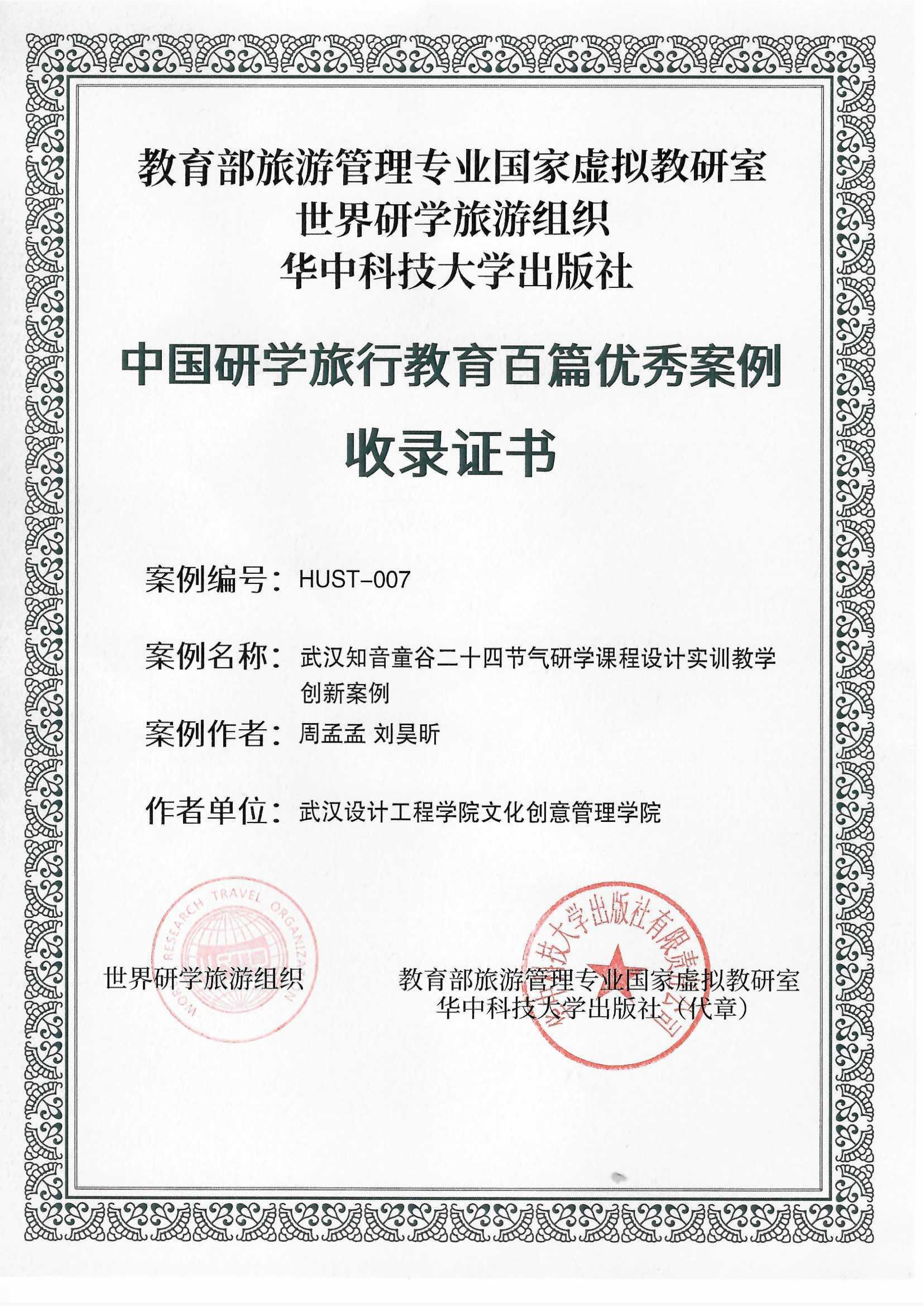 本网讯(通讯员 周孟孟)近日,文化创意管理学院周孟孟、刘昊昕老师共同撰写的《武汉知音童谷二十四节气研学课程设计实训教学创新案例》入选中国研学旅行教育百篇优秀案例。