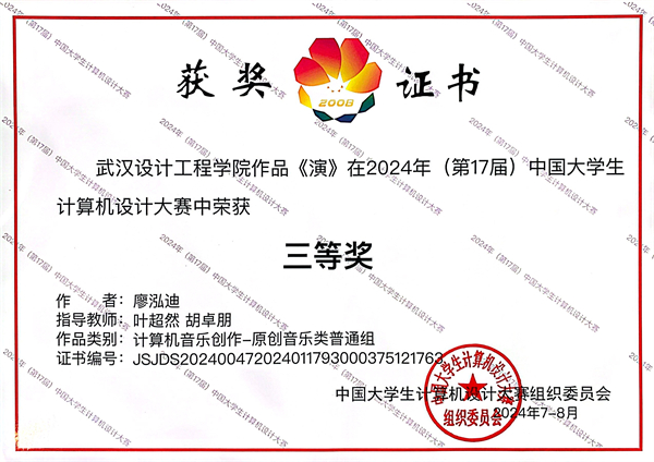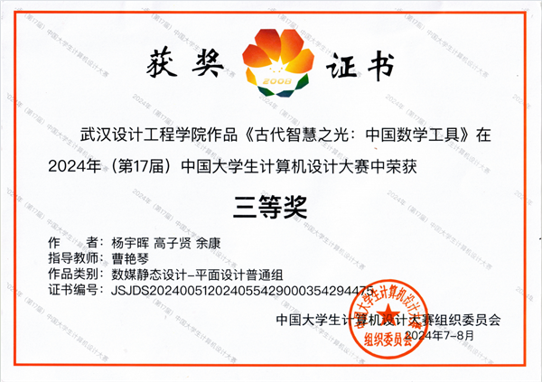在沈阳赛区“微课与教学辅助/数媒静态设计”类决赛现场,智能工程学院教师曹艳琴带领学生杨宇晖、余康、高子贤反复演练,创作作品《古代智慧之光:中国数学工具》,同来自中国人民大学、厦门大学、武汉大学、四川大学、哈尔滨工业大学、华中科技大学、东北大学等全国490所高校的885件作品角逐,荣获“数媒静态设计—平面设计普通组”全国三等奖。“信息可视化设计/计算机音乐创作”类决赛在杭州赛区举行,成龙影视传媒学院学生廖泓迪,在指导老师叶超然、胡卓朋的共同指导下创作的作品《演》,从全国292所高校、482支队伍中脱颖而出,荣获“计算机音乐创作—原创音乐类普通组”全国三等奖。