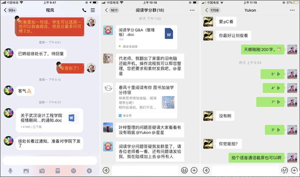 在线上选修阅读学分课程模块推出前,图书馆馆员们反复测试答题模块,常常探讨、修改最佳方案到凌晨。3月10日上午9点题目正式发布前,他们还做了最后一次作业模块的优化。面对读者的在线咨询和读者作业提交的问题反馈,每个馆员身兼多职,大家纷纷变主播、变教师、变客服,在qq、微信、电话端不停转换,努力在第一时间及时总结了关于阅读学分的问题集锦和阅读答题的图文说明。