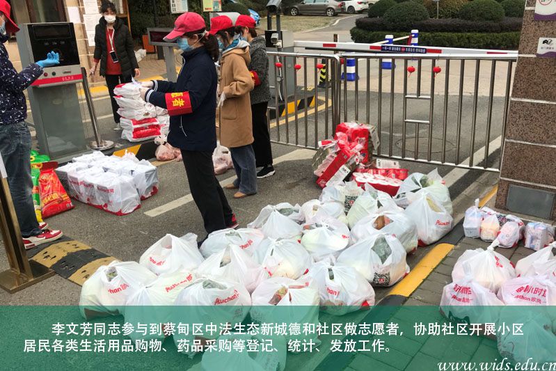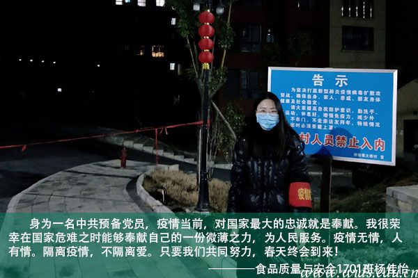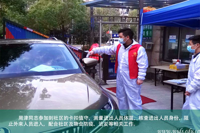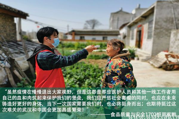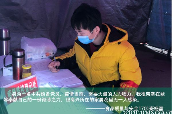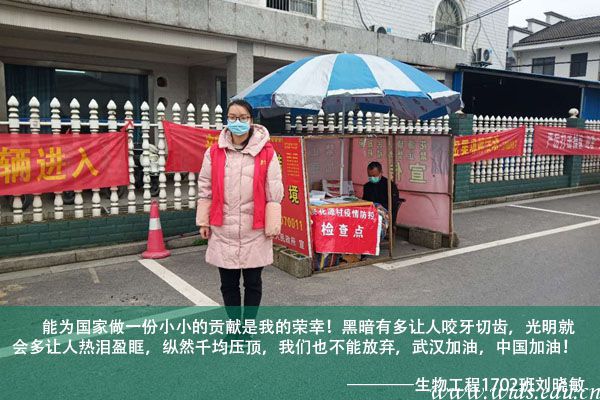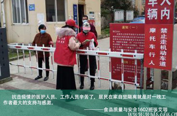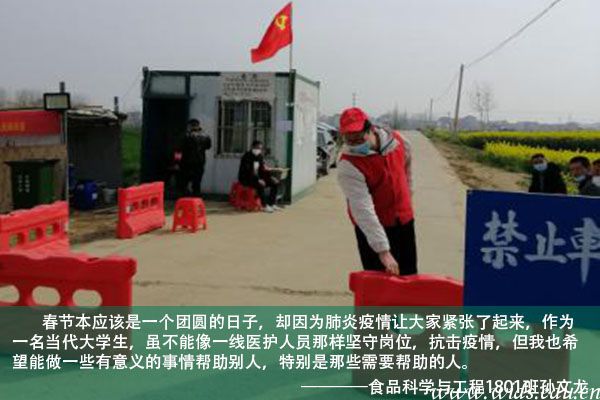 学院副院长李文芳同志率先参与到蔡甸区中法生态新城德和社区做志愿者,分团委书记周津同志主动在居住社区加入卡口值守的志愿者团队。食品质量与安全1701班杨佳怡,生物工程1702班刘晓敏,食品质量与安全1702班王启鑫、周寅鹏,食品科学与工程1801班孙文龙等五名同学,冒着严寒、顶着风雨、不分昼夜,在各自的社区、乡村的卡口坚守执勤,他们对过往人员进行体温检测、登记、筛查,对车辆和物资消毒检查,还积极进行新冠肺炎防控卫生宣教工作,以实际行动筑牢封闭管理防线。