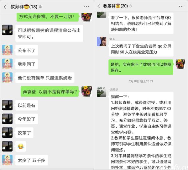 为了更好地服务师生,教务处从各科室中抽出骨干担任在线教学联络员,对口协调服务各院(部)工作,发现、反馈并帮助大家解决教学中存在的问题。在线教学联络员们围绕三个主要教学平台分别组建了工作群,负责超星学习通、智慧树、中国大学生慕课三个平台的咨询与服务工作,与平台客服一起为师生提供线上教学技术服务与指导。