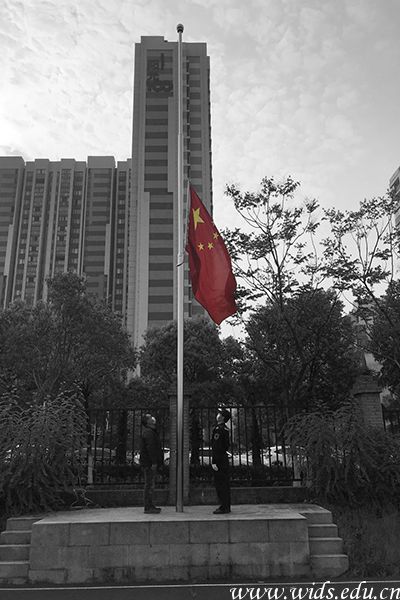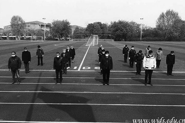 上午9时50分,在学校运动场国旗台,五星红旗随着太阳冉冉升起,在短暂的定格后缓缓下降至距离旗杆顶端三分之一的位置。10时整,学校值班值守人员、教师代表在国旗下神情凝重肃立,向抗击新冠肺炎疫情斗争牺牲烈士和逝世同胞默哀三分钟。