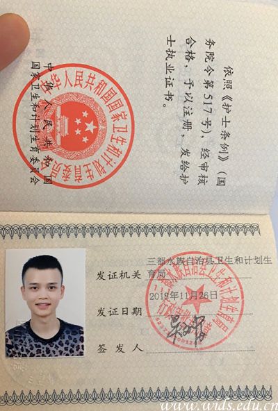 谢成是护理专业1801班学生,他早在2018年就通过了护士资格考试并成功注册。“2020年的寒假,我和往常一样回到了老家贵州省黔南布依族苗族自治州三都水族自治县,但是这次寒假与以往不同,全民都在‘战疫’,身为一名护理学子,在国家危难时刻我更加想要运用所学知识尽力做些什么。”