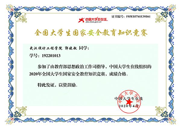 商学院国际经济与贸易1901班郭晓敏获得“全国大学生国家安全教育知识竞赛”成绩合格证书。