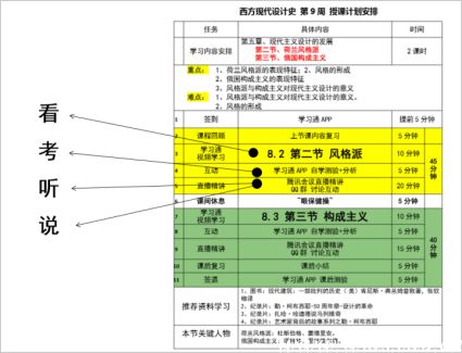 本学期胡老师承担了《西方现代设计史》9个课堂的教学任务,授课学生人数达到984人,课程访问量145622次,授课过程中进行腾讯会议直播90次、学习通互动457次,发布考试 45次,主题讨论14163次。为了配合《西方现代设计史》这门课的有效学习,胡老师还选用了学银课程《设计艺术史》做为补充教学资源。为期10周的线上教学中胡老师摸索出来一点经验和大家分享。
