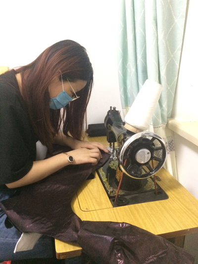 盛文君借朋友家的老式缝纫机完成作品的缝制。