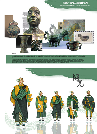 毕业生李时颖的作品《铜光》,将青铜器物的造型、图案、肌理重新组合,充分运用到服装中。