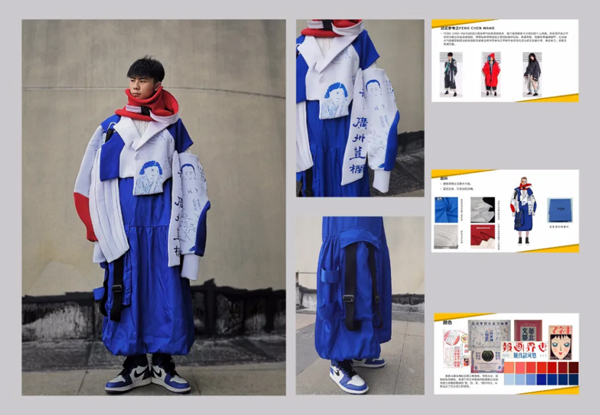 远看是极富个性的红白蓝三色潮服,近看还能在衣服上发现有趣的大字图文。毕业生辛诗雨的作品《Crush LAN》从汉字中寻找创意,设计出的国潮服装别具一格。然而,设计图确定之后,疫情的突发让她一度找不到合适的布料和做衣店铺。“我只好在网上不停地查找、询问,终于在淘宝上找到了可以发货的做衣店铺和开门营业的布料店铺。”幸运的是,衣服经过白坯、样衣、成衣的修改制作并顺丰寄回之后,她还找到了一位模特。没有相机,她就拿手机自己充当摄影师为模特进行拍摄,再在老师的帮助下进行后期剪辑,最终完成了自己的毕业设计。
