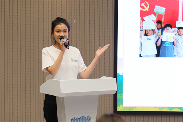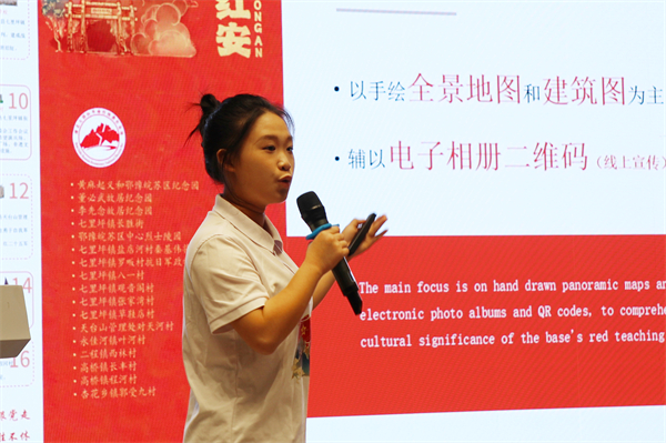 “星星之火,可以燎原。我们相信在乡村儿童心里种下的种子,终将在未来的某一天生根发芽,开出绚丽的花朵。也许在下一个阳光明媚的午后我们会再次相逢,希望那时乡村会更加美好,孩子们也更加优秀。感谢相遇,期待回响!”来自成龙影视传媒学院的“回乡回响”团队代表金蕊蕊满怀自信地介绍团队实践成果,她们的实践内容分为公益支教课堂和宣传美丽乡村两个方面,通过丰富多彩的教学课程,打造乡村艺术“大课堂”。来自时尚设计学院马婷婷同学代表“尚美筑安”社会实践团队进行汇报,他们以跨学院、跨专业的形式展开合作,深挖红色文化理念及地域特色,进行线上线下产品测评,分阶段逐步完成实践目标。“反转胶片相册、手绘插画明信片、基地红色教学点地图……”这些特色文创作品,加上她的自信展示、精彩分享,获得连连称赞。