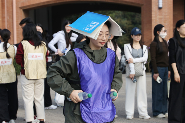 “预备,开始!”“顶天立地”项目率先在得一堂广场开展比拼,参赛队伍分别在不同赛道的起点和终点处列队站立5人,起点处的一名队员将一本打开的书籍放置在头顶,双手各握一瓶矿泉水,稳步向终点行进,到达终点后,将道具交给下一位队员,如此循环接力,直至原来站在终点处的队员全部到达起点,用时最短获胜。参赛人员为了保持平衡,用尽了各种方法和姿势,不时引发观众欢呼声、加油声此起彼伏。