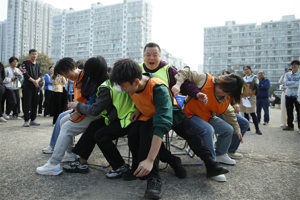 “1、2、3,走……”去年竞争最为激烈的项目“当仁不让”,今年依旧火热。裁判员指令一出,两支队伍分别派出的5名队员立马围着9把椅子小碎步绕圈走动。“3、2、1,坐!”在一阵惊呼声中,抢到“宝座”的老师们神气坐定,喜气十足,没有抢到椅子的人则怏怏离开。