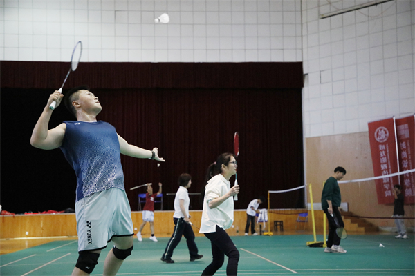 羽毛球混双比赛现场,参赛选手自信挥拍。刘恒 摄