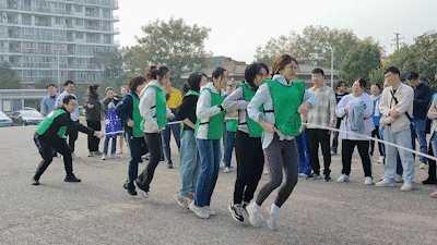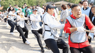 “重心放低,身子后倾,一起喊一二三,往后用力拉。”在拔河比赛中,双方队员个个咬紧牙关,拼尽全力向身后拽紧绳子,其他队友则在一旁齐声高喊“加油!加油……”绑在绳子中间的红绸带来回移动,揪着全场人的心,现场气氛时而陷入拉锯而焦灼,时而被胜利而点燃。