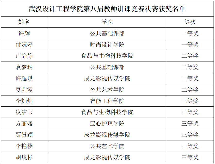 24名参赛教师分两场进行课堂教学展示后,评委从教学设计、课堂教学两个方面进行综合评分。最终,公共基础课部许辉、时尚设计学院付婉婷2位老师摘得本届教师讲课竞赛一等奖,食品与生物科技学院卢静静等4位老师获二等奖,智能工程学院李灿灿等6位老师获三等奖。公共基础课部、公共艺术学院获优秀组织单位奖。