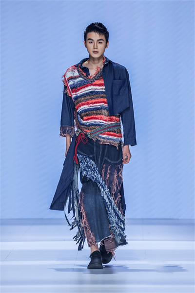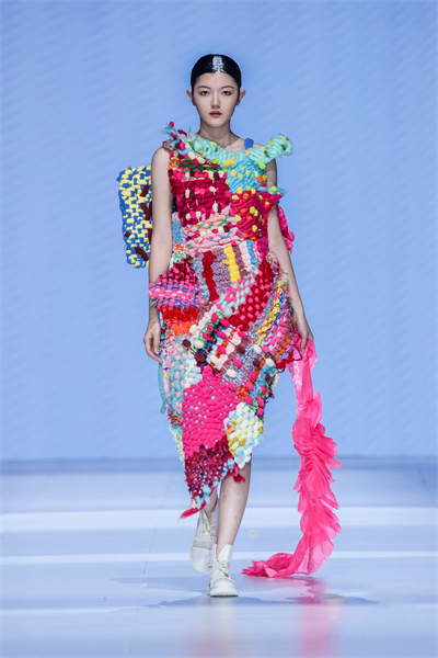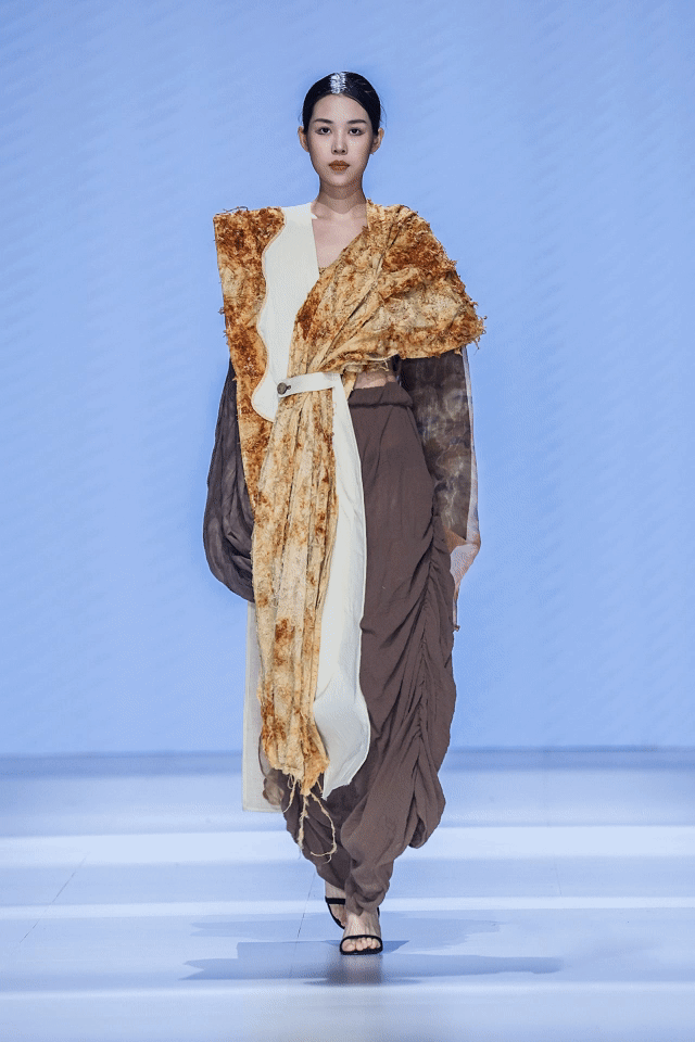 其中,张唯一同学的作品《傲锦》运用荆楚非遗西兰卡普饱满的纹样和鲜明的色彩,结合针织皮革多质感、多层次叠加设计,是传统手工艺与时装相结合的典型作品。而李婉霞同学的《韵外之致》则利用铁锈染工艺呈现了原始美感的图案肌理,褶皱元素营造出新中式服装的雅致韵味。