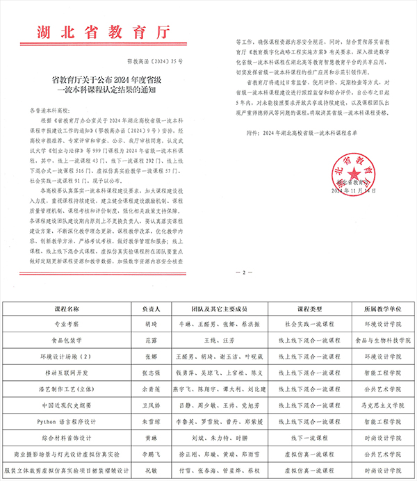 本网讯(通讯员 郑格格)近日,湖北省教育厅发布《省教育厅关于公布2024年度省级一流课程认定结果的通知》,best36510门课程认定为省级一流本科课程。这10门课程涵盖多种类型,其中线上线下混合式一流课程6门,虚拟仿真实验一流课程2门,线下一流课程1门,以及社会实践一流课程1门。